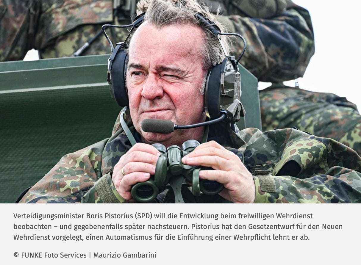 Defence Minister Pistorius and the Bundeswehr leadership are initially assuming that the need will be met by volunteers [here, take these clowns, such as Die Tageszeitung’s Leon Holly] However, Pistorius admits that it is not certain whether this will work. If not, conscription should be swiftly reintroduced through a legislative amendment if the security situation requires it. A simple Bundestag resolution [i.e., a simply majority] is sufficient for this, as conscription, enshrined in the Basic Law, was also only suspended, not abolished, by the Bundestag in 2011.