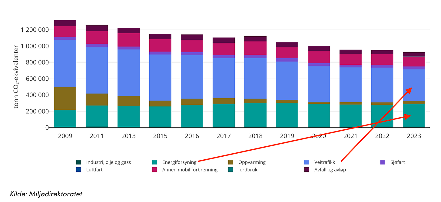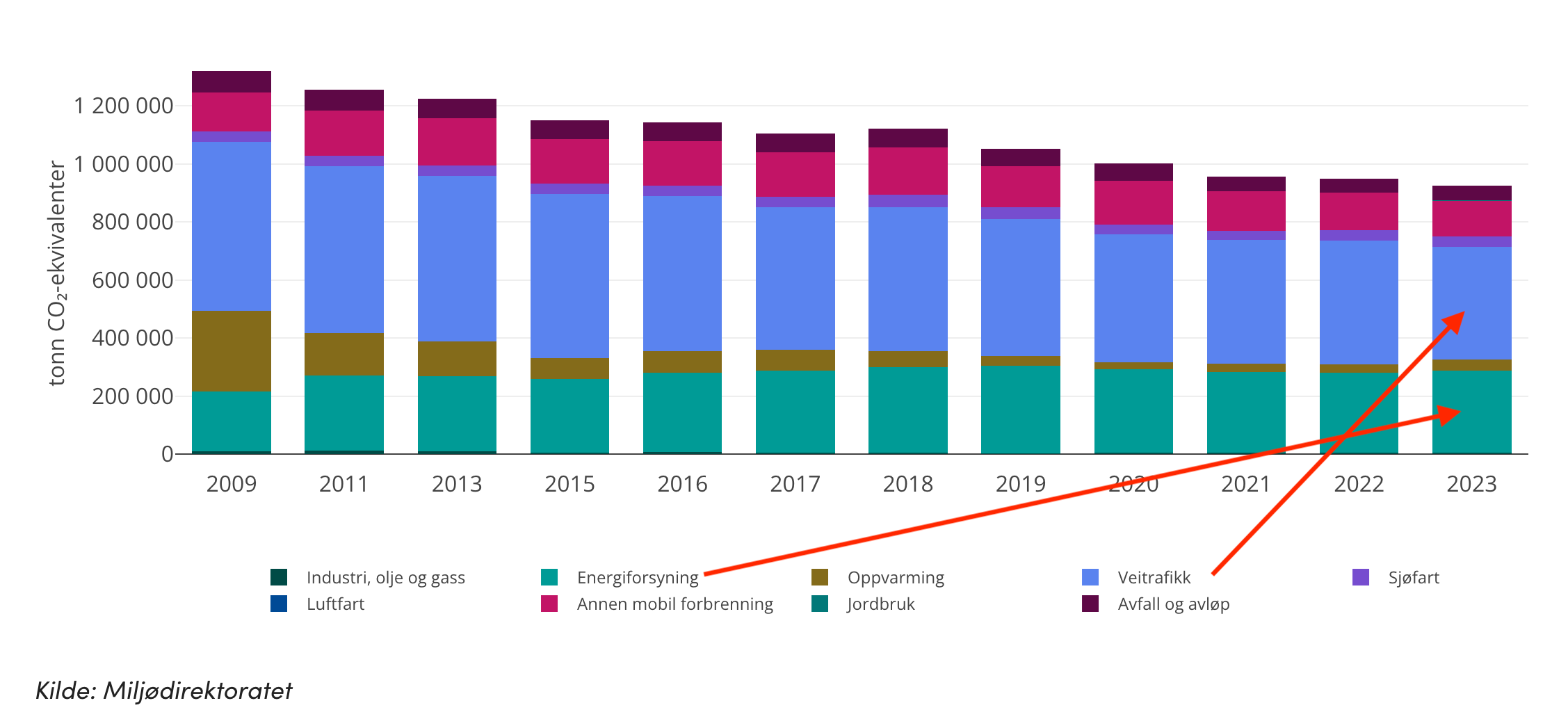 To me, ‘energy generation’ (Energiforsyning) is a tad bigger than whichever category under which ‘construction machinery’ is subsumed; although I don’t know for sure, I consider it to be categorised under ‘manufacturing, oil, and gas (Industri, olje og gass), which is absent from the 2023 data™ (more on this in a moment); look at the brown sliver, which is ‘heating’ (Oppvarming), which constitutes around 38K tons of CO2 emissions equivalents per year and is thus in the ballpark of emissions savings™ as projected by the City Council’s mandate for EV construction machinery.