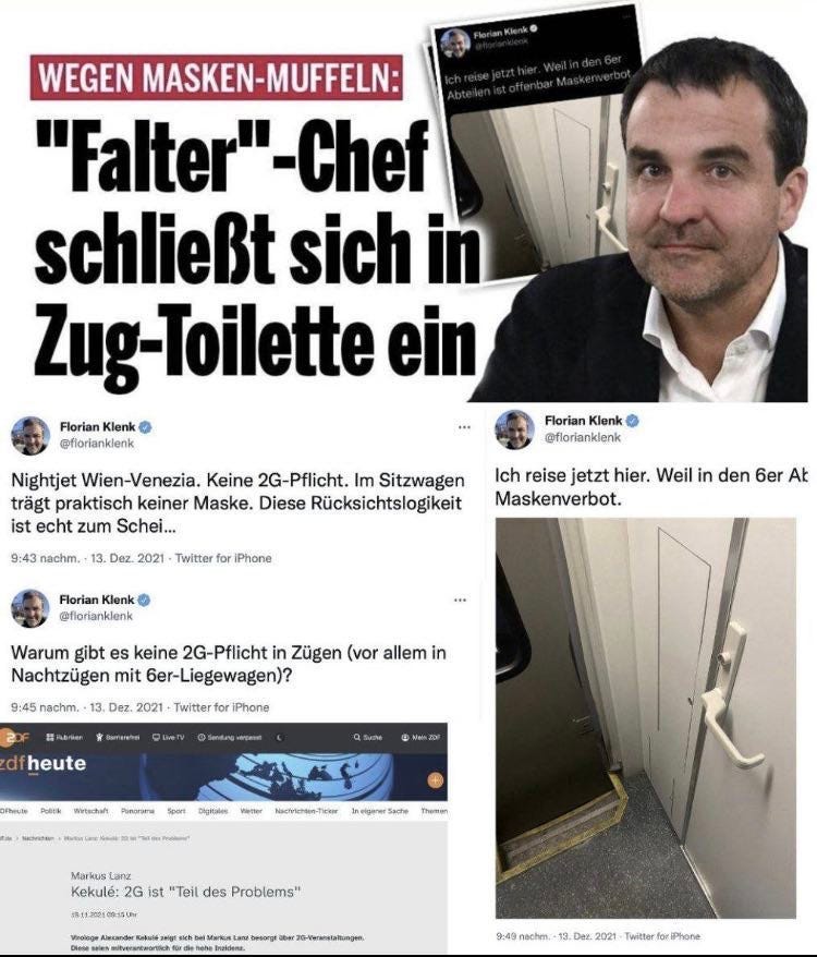To sum up—woke ’journo’ and Zero Covid (moron) Florian Klenk was so afraid that he locked himself into the train’s toilet to ‘avoid exposure’.