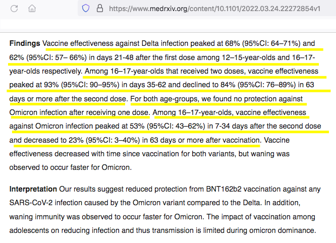 There’s the following paragraphs on ‘vaccine efficacy in the young’ (12-17yo) from August 2021 to January 2022; there’s a recent IPH-sponsored pre-print that covers both Delta and Omicron with respect to the BioNTech/Pfizer product (Comirnaty), which I shall reproduce in full: