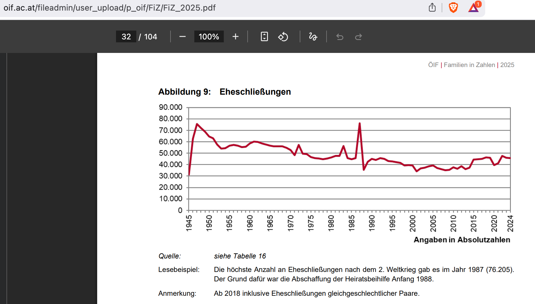 The highest number of marriages after WW2 occurred in 1987 (76,205). The reason being the abrogation of gov’t marriage subsidies [orig. Heiratsbeihilfe] as of 1988.