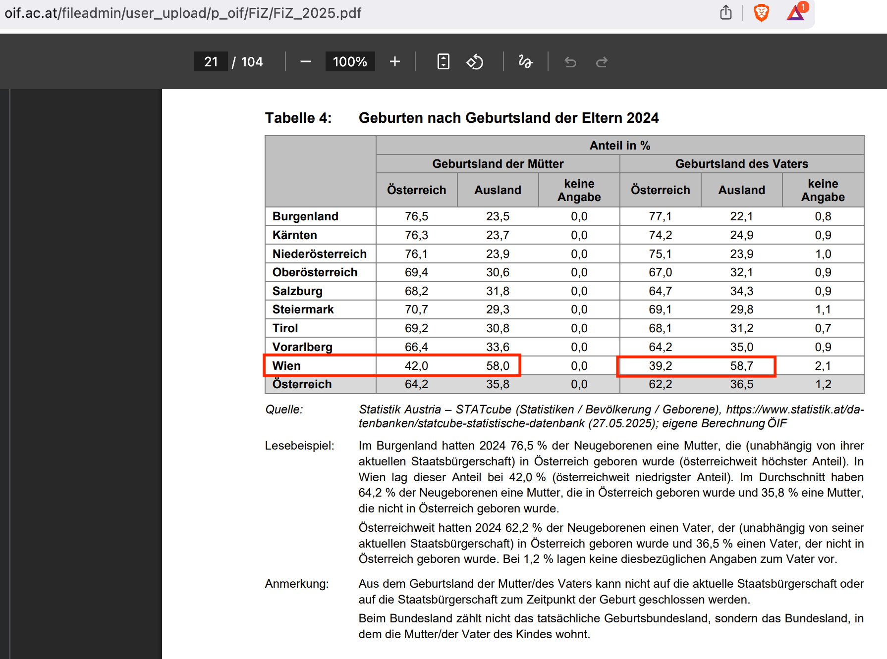 As to more particulars, well, here we go, as in, table 4 showing births to Austrian and (vs.) immigrant parents (mothers to the left, fathers to the right):