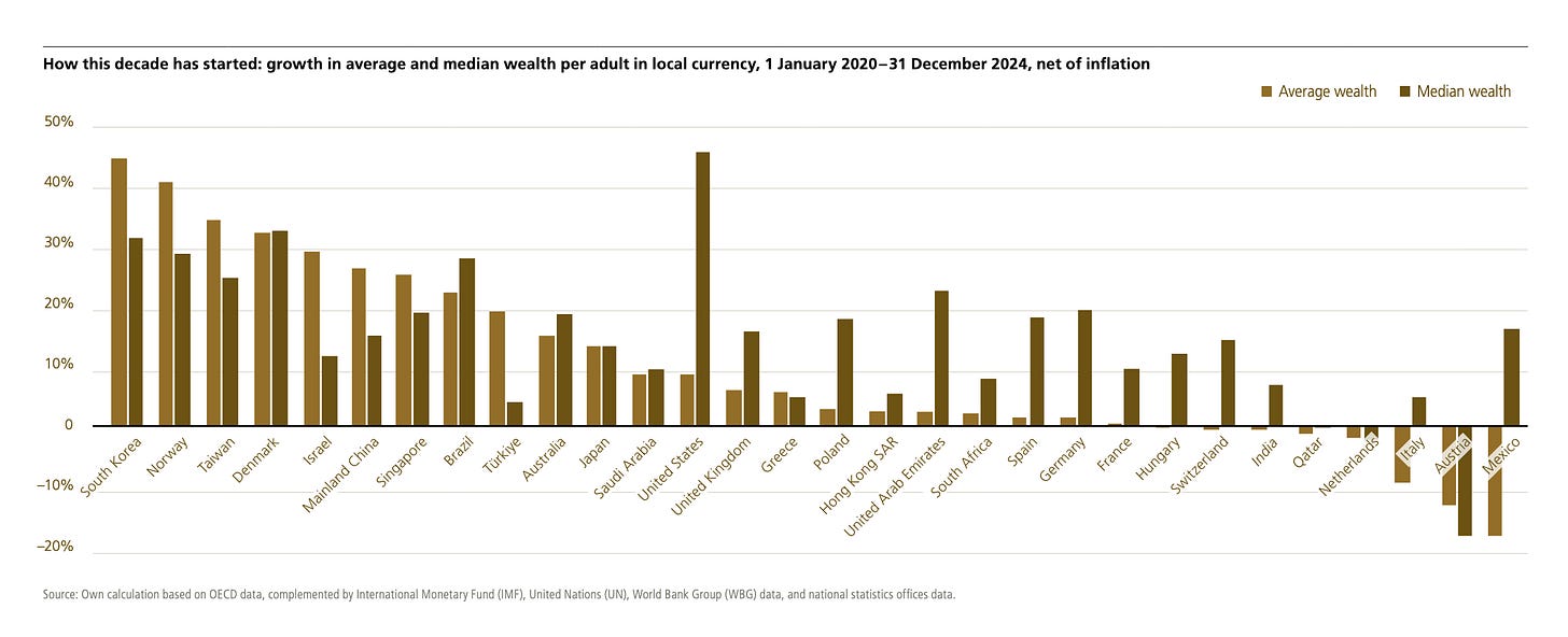 ‘Real’ changes in wealth per adult from the beginning of 2020 to the end of 2024 reveal longer-term trends. Austria emerges as a major outlier, with median wealth per adult falling by 18% [that would be the consequences of Covidistan’s Pandemic™ responses]. The Netherlands (–2.3%) and Estonia (-0.1%) followed.