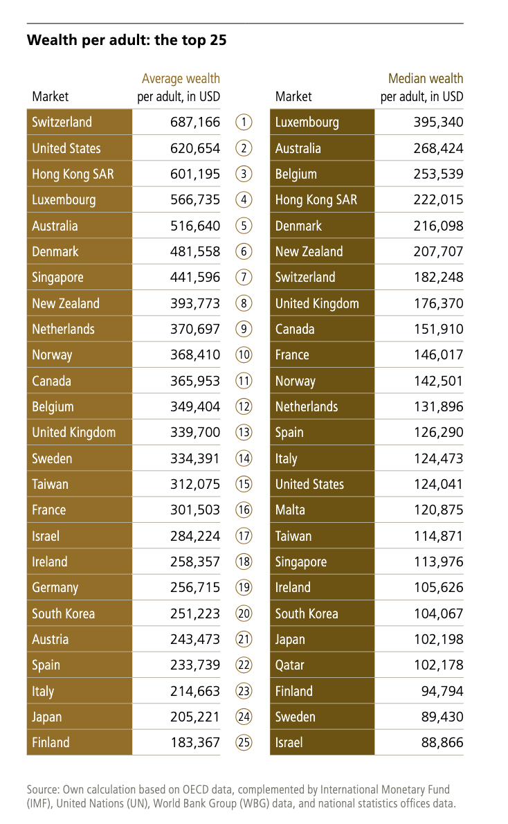 Switzerland, the wealthiest country per adult, saw a 7.7% increase. Sweden and other Nordic countries also recorded strong growth, each exceeding 10%.