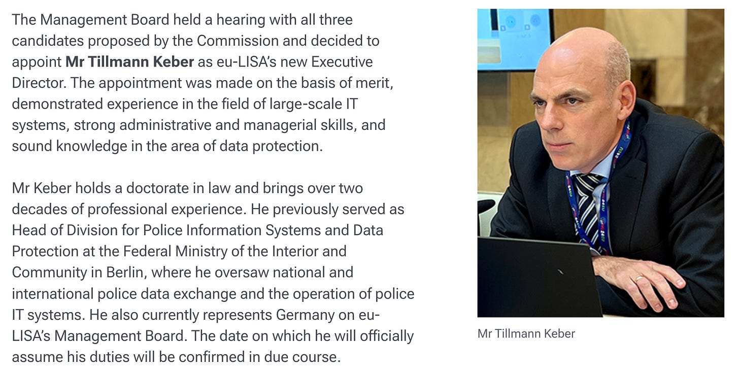 That agency—which I bet you likely didn’t know existed—is headed by (drum roll) none other than Tillmann Keber, as the eu-LISA website informs us: