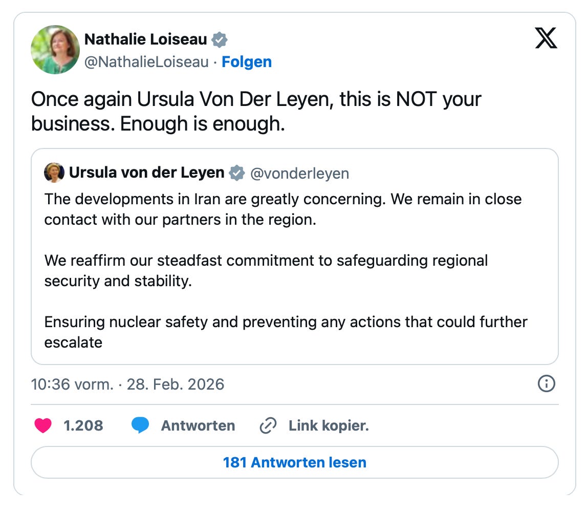 German legacy media now reports™ that Ursula Von der Leyen has come under severe pressure over the EU’s formal positioning in regard to the US-Israeli unprovoked and illegal war of aggression against Iran.